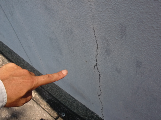 岸和田市の雨漏り修理で、雨漏り箇所の真上にあるバルコニーの防水を行うことになり、前回、防水面の下地調整(ケレン・清掃、ひび割れ補修、カチオンクリート塗布)をご紹介しました。写真は、ひび割れ ...続きを読む2025/09/22 岸和田市西之内町の反り返った外壁パネルの固定とクラック補修など