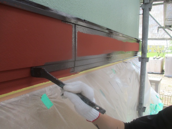 市貝町のコロニアル屋根とリシン吹付外壁の塗装工事が完工しました。 幕板の中塗り中です。 幕板と外壁の取り合いを刷毛で見切り塗装してから、ローラーでは塗料だまりが出来てダレが出るところを、、刷毛で塗装中です。 中心部分はローラーで塗装しました。 ...続きを読む2021/05/25 橿原市で野地板の増し張りが終わり、防水紙を張る作業をします