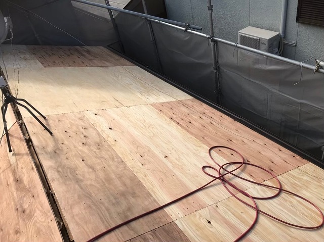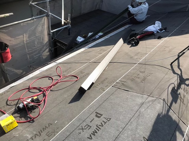 ■足場架けのあと、メッシュシートをかけた現場から本日は淀川区のマンションより、屋根の葺き替え工事の工程のひとつである防水シート張りと、古い板金の撤去の様子をご覧いただきます。現場はアスファルトシングルの屋根で、こちらにガルバリウム鋼板立平葺きでカバー工法いたします。アスファルトシングルの上に新しい防水シート「 ...続きを読む2021/05/25 住吉区|外装塗装前の養生とシーリング打ち替え工事④