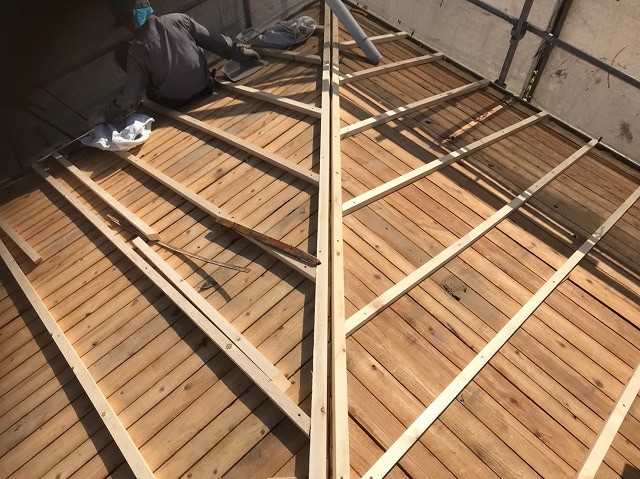 香芝市で築37年の瓦屋根の葺き替え工事の最中です。前回土葺きの撤去完了で野地板が現れました。野地板の状態は古く傷んでいましたがそのまま使用し増し張りできる状態でした。今回は傷んだ野地板を垂木で補強していきます。増し張りはそのあとです。(次回ご紹介してきます。)では、本日もよろしくお願い致します。 ...続きを読む2021/05/25 橿原市で下地の不陸調整が終わり野地板を張る作業に入ります!