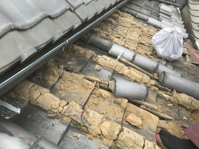 都島区の店舗兼事務所となっている建物のお部屋より雨漏りが発生しました。現場調査したところ原因は恐らく金属屋根のパラペット部分の笠木板金からの雨水侵入のようです。金属製の立平葺きの屋根でしたが、パラペットと呼ばれる囲いのような部分の笠木板金の劣化が相当進んでいました。パラペットとは手すり壁とか胸壁などとも呼ばれ ...続きを読む2021/05/25 寝屋川市|瓦屋根全体の劣化の様子。棟や熨斗瓦下の漆喰劣化とは?2