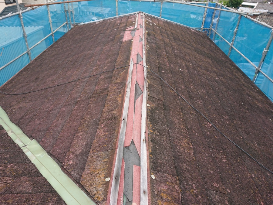 岸和田市のT様より「台風で雨漏りしてるんです」とのご相談をいただき、屋根の修理を行いました。2年前の台風で、2階と1階のお部屋の天井に雨漏りが発生し、調査にお伺いすると、棟の内側に雨水が廻っている形跡があったので、雨漏りに関係する降り棟を解体して積み直すことになりました。 ...続きを読む2025/09/17 泉佐野市の屋根調査で瓦のズレを修正し板金屋根を塗装することに!
