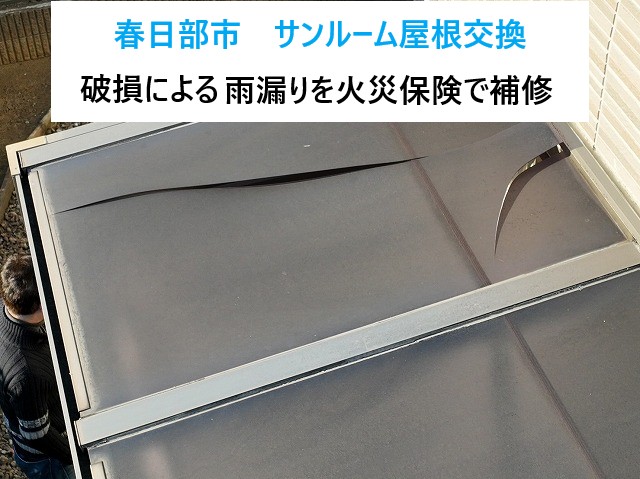 貝塚市のH様より「1階の和室の天井に雨漏りしてるんです。急だったので驚いて・・・」とのご相談をいただき、雨漏り調査を行うと、雨漏りしている和室の上にある下屋のスレートが数枚割れている状態で、雨漏りの原因の可能性があることから、シーリングで補修することになりました。H様邸の構造・・・木造・2階建てで、屋根には厚 ...続きを読む2025/09/12 春日部市 サンルーム屋根交換!破損による雨漏りを火災保険で補修!