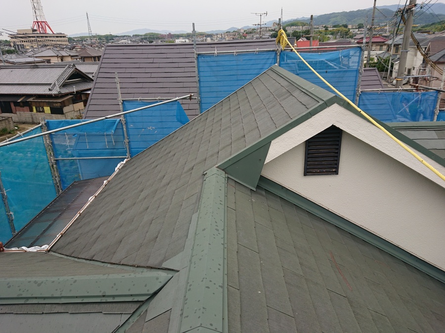 岸和田市のモルタル仕上げの外壁塗装です。N様邸は奥の敷地に増築されていて、今回の工事で本宅の瓦屋根を葺き替え、増築部のスレート葺きの屋根と両方の建物の外壁を塗装することになりました。この記事では外壁塗装の様子をご紹介します。高圧洗浄で外壁に付いた汚れや旧塗膜などをきれいに洗い落として、しっかりと乾燥させてから ...続きを読む2025/09/12 熊取町の台風被害の調査でセメント瓦の屋根の調査にお伺いしました