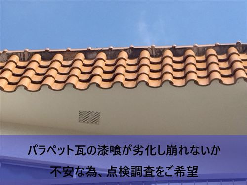 みなさま、こんにちは!街の屋根やさん飯田・伊那店です! 伊那市東春近にて、築15年を迎えたセキスイハウスのT様邸におじゃましました。しっかりとした構造と快適な住み心地が魅力のセキスイハウスですが、コロニアル屋根にはコケや樹液がつきやすく、だんだんと見た目も気になるように…。「そろ ...続きを読む2025/09/8 堺市南区でパラペット瓦の調査のご依頼|漆喰の剥がれや冠瓦を調査しました