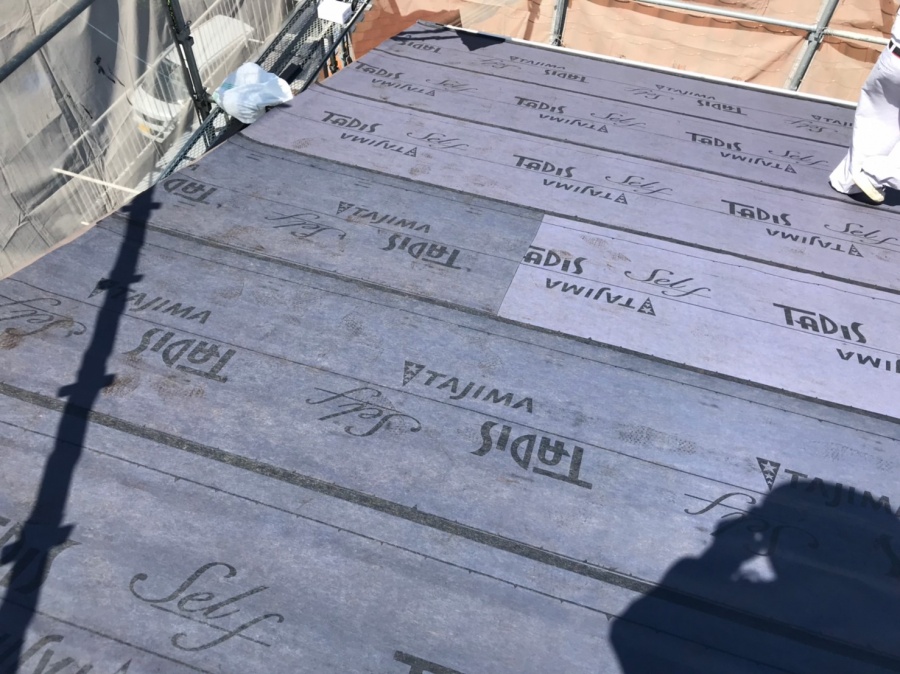 西条市氷見のセメント瓦(S型スレート)屋根から陶器平板瓦への葺き替え工事の現場です。 軒先の広甲に軒先水切り板金を取り付けます。これは瓦の軒先部分にまわる水が広甲を濡らさないようにするもので、水切り板金の上にゴムアスルーフィングをのせます。雨水の流れを考慮し ...続きを読む
