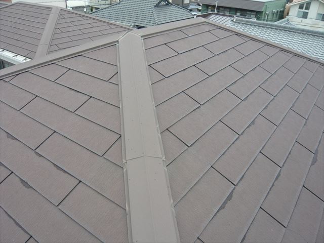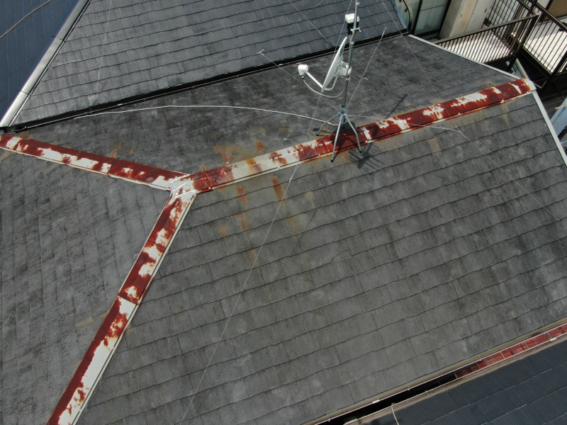 ★東大阪市にて屋根の現地現場調査を行っています。★こちら画像が、屋根の全景になりまして、棟板金部分が、一目でサビついているのが、確認できますね。勿論このままサビを落としてから塗装下塗り(サビ止め材)が可能なのですが、やはり棟板金鉄部が劣化が進んででいるために、新しく棟板金を取り替える事推奨してい ...続きを読む