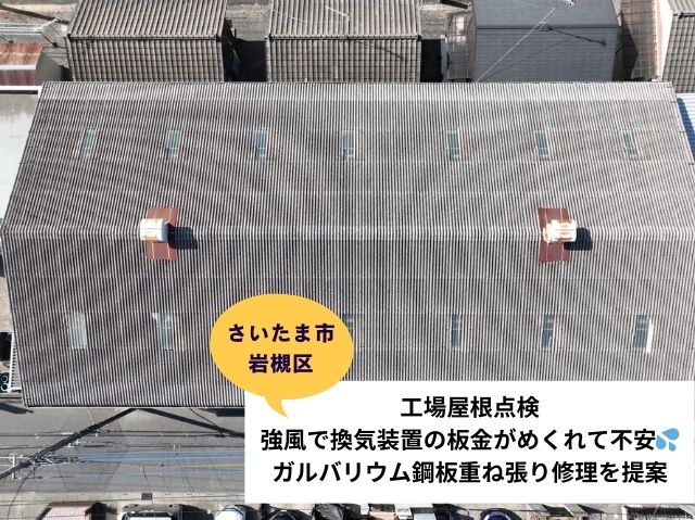 2025/09/2 さいたま市岩槻区 【工場屋根点検】強風で換気装置の板金がめくれる~ガルバリウム鋼板重ね張り修理をご提案~