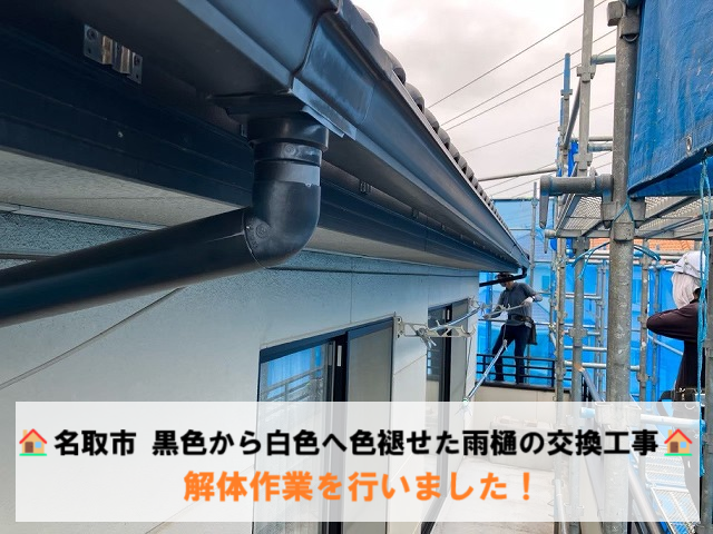 外壁は住宅を守る大切なバリアですが、日々の雨風や突発的な衝撃でダメージを受けることがあります。特にモルタル外壁は強度に優れていますが、ひび割れや欠損が生じやすく、そのまま放置すると雨水の浸入や劣化の進行を招いてしまいます。 今回は、実際に飛来物によってモルタル外壁が破損したお住まいで、外壁補修を行った事例をご ...続きを読む2025/08/31 名取市 黒色から白色へ色褪せた雨樋の交換工事 解体作業を行いました!