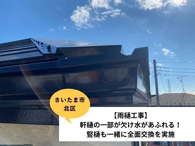 こんにちは。街の屋根やさん名古屋南店です。 前回のブログでは、名古屋市緑区の住宅で実施している外壁塗装工事の雨樋に対する塗装の様子をお伝えいたしました。 今回は、下屋根の雨押え板金や土台水切りなどの鉄部に対する塗装工程について、その施工の様子をご紹介したいと思います。 ...続きを読む2025/08/26 さいたま市北区 【雨樋工事】 軒樋の一部が欠け水があふれる! 竪樋も一緒に全面交換を実施