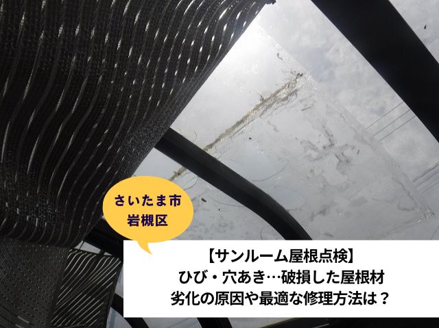 こんにちは、街の屋根やさん熊本店です。今回は熊本市南区にて、大雨時のみ雨漏りが発生するという住宅の雨漏り修理を行いました。屋根の立ち上がり部分の板金や、箱樋のオーバーフローなど複合的な原因で雨漏りしていたため、雨漏りの原因を一つずつ解消していきました。 ▶メールでのお問合せはこちら(24時間受付 ...続きを読む2025/08/25 さいたま市岩槻区 【サンルーム屋根点検】 ひび・穴あき…破損した屋根材~劣化の原因や最適な修理方法は?