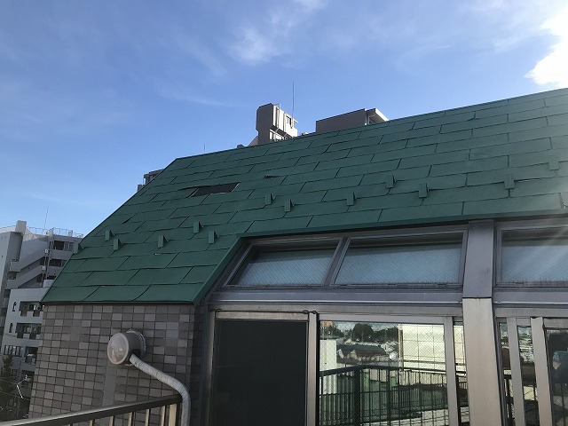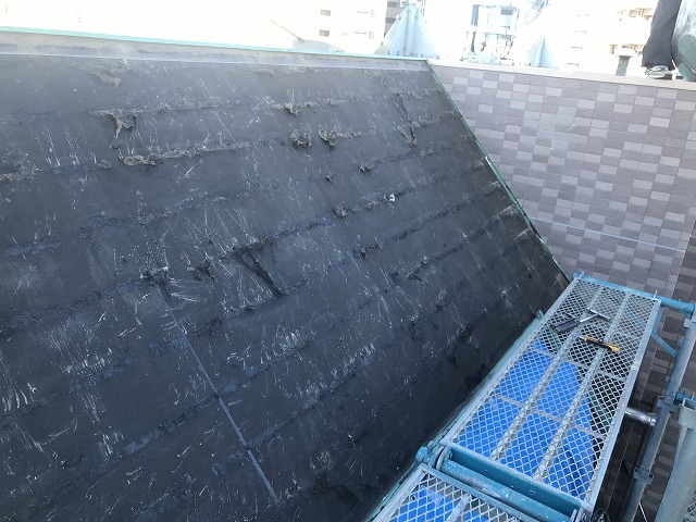 本日ご紹介いたしますのは武蔵野市境で行ったウレタン防水工事の様子です。バルコニーにはずいぶん前から床に亀裂が発生しており、その下の軒天からポタポタと雨漏りしているとのご相談を当初いただきました。バルコニーの下にお部屋がないこともあり、直接居住スペースが被害を受けることはありませんでしたが、雨漏りは放置する期間が長くなると壁や ...続きを読む2019/06/8 鴨川市東町でスレート屋根の劣化が気になり、塗装をお考えのお客様
