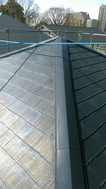 早速現地にて屋根の上に登り確認した所、カラーベストを抑えている棟板金が5本無い状態でした。下地の木も腐っています。確認後、下に降りて施主様に写真を見せて現在の状況を報告しました。その後、打ち合わせさせて頂いた結果。①無くなった5本のみ棟板金を取替工事。②全ての棟板金を下地木共に取替工事。③足場を建てて、既存の屋根材の上からシルキ ...続きを読む2018/09/28 屋根のリフォ-ム コロニアルの上にシングル材を貼りました。