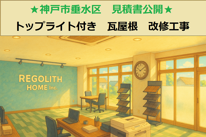 このたびの令和7年8月に九州地方を襲った記録的な大雨により、各地で住宅被害や浸水、土砂災害が発生しました。被害に遭われた皆さまに、心よりお見舞い申し上げます。 熊本県内でも床上浸水や住宅の破損、雨漏りも多数報告されており、当店でも屋根や外回りの住宅修理・点検のご相談を多数いただいております。 ...続きを読む2025/08/19 神戸市垂水区 見積書公開!トップライト付き 下屋根 瓦屋根改修工事