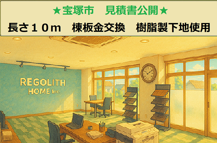 「地震のあと、家の周りを確認していたら、基礎部分にヒビが入っているのを見つけてしまって…」と五泉市にお住まいの方より、このようなご相談をいただきました。お住まいは築18年の一戸建て住宅。普段はなかなか意識しない「建物の基礎部分」ですが、地震の揺れのあとに異変を感じる方は少なくありません。今回は、 ...続きを読む2025/07/10 宝塚市 見積書公開!長さ10m 棟板金交換 樹脂製下地 エコナンバー使用
