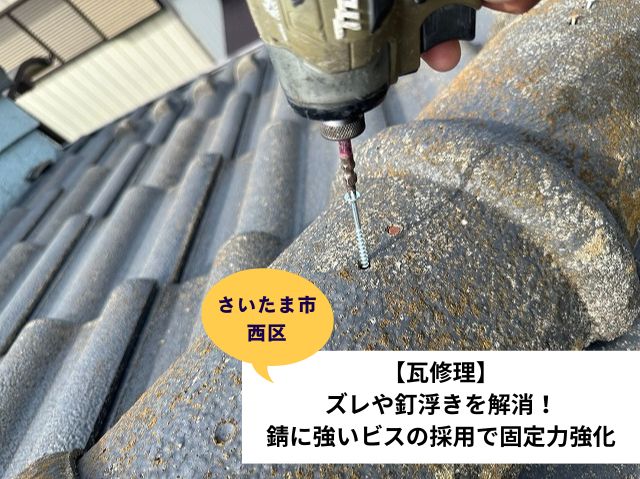 明石市・神戸市エリアで外壁塗装や屋根工事、防水改修を行っている「街の屋根やさん明石・神戸店」です。ブログをご覧頂きありがとうございます🌸 明石市のお客様より、「1階の天井から雨漏りしている」とご相談をいただき、現地調査を行いました。 1階天井の雨漏り調査を行ったところ、真上にある2階ベランダの ...続きを読む2025/07/4 さいたま市西区 【瓦修理】ズレや釘浮きを解消!錆に強いビスの採用で固定力強化