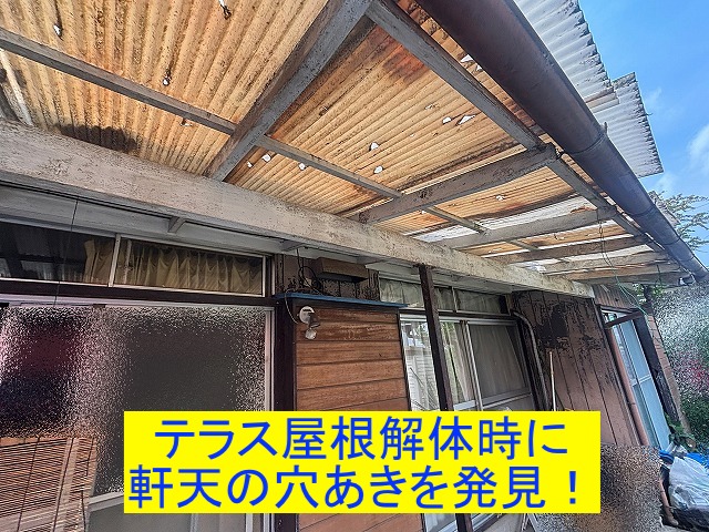 2025/06/30 水戸市 テラスの波板を解体すると見えなかった危ない軒天の穴あき確認