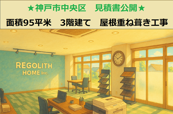 みなさまこんにちは。街の屋根やさん広島店です!いつもブログをご覧いただきありがとうございます(^^)/広島市佐伯区にある戸建て住宅にて雨漏りのご相談をいただきました。今回のブログでは、現地調査の様子とご提案内容についてご紹介していきます!◆街の屋根やさん広島店では、雨漏りが発生している場合、原 ...続きを読む2025/06/30 神戸市中央区 見積書公開!面積95㎡ 3階建て カラーベスト屋根への重ね葺き