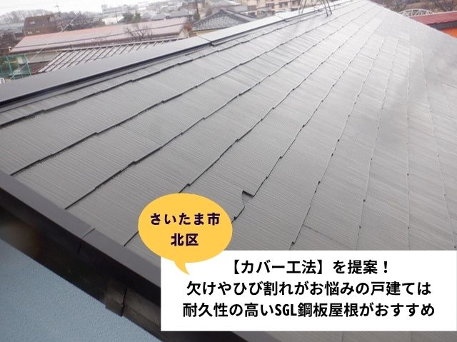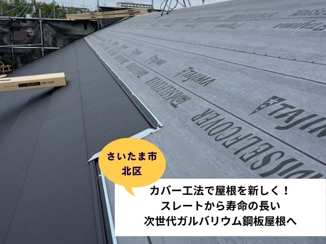 岐阜市で庭先に屋根材が落下しており、不審に感じたお客さまからご相談をいただいた事例記事の続きを紹介していきます。原因は強度問題を抱えたパミールが使用されていたためで、早めのメンテナンス工事が推奨される状態でした。前回の記事 ↓ 【岐阜市で屋根の破片が庭に落下し不審に感じたお客さまからのご相談、現地調 ...続きを読む2025/06/18 さいたま市北区 カバー工法で屋根を新しく!欠けたスレートから耐久性のある次世代ガルバリウム鋼板屋根へ