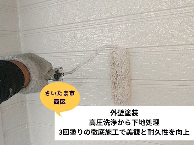 田原市の皆さんこんにちは。街の屋根やさん豊橋店です。足場を有効活用し、外装をフルメンテナンスしたらいくらかかる?とのご相談を受け、現地調査に伺いました。前回の記事 〜瓦屋根の調査ブログ〜前回の記事 〜外壁サイディングの調査ブログ〜前回の記事 〜軒天塗装の調査ブログ〜前回の記事 〜雨樋の点検・清掃のブログ〜この ...続きを読む2025/06/19 さいたま市西区 【外壁塗装】高圧洗浄から下地処理、3回塗りの徹底施工で美観と耐久性を向上