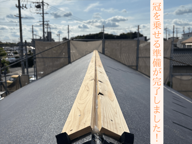 棟板金(冠)をしっかりかぶせて固定! 前回は棟を乗せる下地作りをしました。 この貫板の上にを被せていきます! この棟板金は、屋根の一番高い部分を覆い、雨風から内部を守る重要な部材です 位置がズレないよう慎重に調整しながら、真っ直ぐに取り付けて ...続きを読む2025/06/15 瀬戸市で下屋のスーパーガルテクト施工!下屋の野地の高さ直しから開始します!
