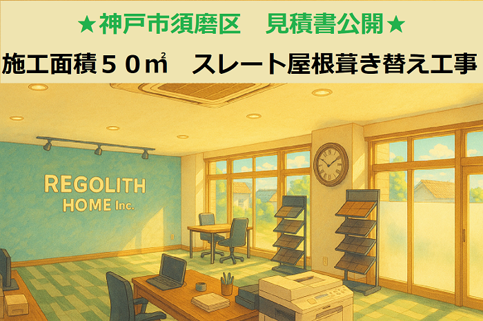 こんにちは、街の屋根やさん熊本店です。今回は、熊本市中央区にお住まいのお客様より「家の庇(ひさし)に水が垂れて気になっている」とご相談をいただき、現地調査に伺いました。他の業者さんにも点検を依頼されたそうですが、原因が分からなかったとのことで、当店にご相談いただきました。目視だけでは分からない漏水原因もあるた ...続きを読む2025/06/13 神戸市須磨区 見積書公開!施工面積50㎡ 切妻 スレート屋根葺き替え工事