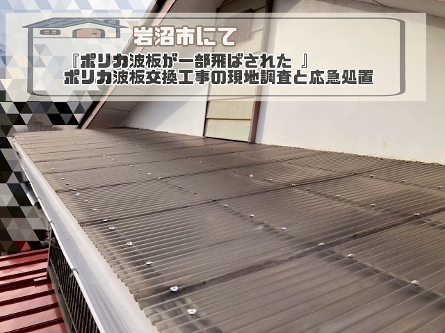 みなさまこんにちは。街の屋根やさん広島店です!いつもブログをご覧いただきありがとうございます(^^)広島市中区で施工した屋上防水の最終工程をご紹介していきます!防水層をしっかりと守るための板金金物取り付けの工程について解説しますよ😊【参考】▼ここまでやりますお住まいの無料点検▼ ...続きを読む2025/05/26 岩沼市『ベランダのブリキ屋根が飛んだ』ベランダポリカ波板の現地調査と応急処置の様子をご紹介!