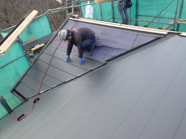 宇都宮市の屋根カバー工事で棟板金を取り付けました。 横暖ルーフの貼り付け中です。 南面の谷樋との取り合いのルーフ貼り付け中で、谷樋の返しにはケミカル面戸を貼り付け、ルーフ内に雨水が入らないように防水がしてあり、谷樋側にはルーフを50ミリ出るように貼り付けていきます。 ...続きを読む2025/05/22 春日井市坂下町で棟を南蛮漆喰で復旧!丁寧な3段構造で安心の仕上がり!