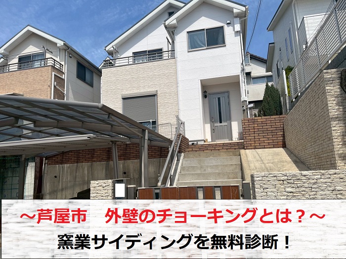 岐阜市で屋根の漆喰調査でおうかがいさせていただいた事例を紹介していきます。当初は屋根の漆喰のみの調査予定でしたが、雨樋に雨樋に枯れ葉の詰まりや劣化が見られましたので雨樋の修理のご提案をすることになりました。雨樋の変形や詰まりはオーバーフローによる雨漏りに直結するため、十分ご注意ください。今回はご相談いただいた ...続きを読む2025/05/13 芦屋市 外壁のチョーキングとは?窯業サイディングを無料診断!