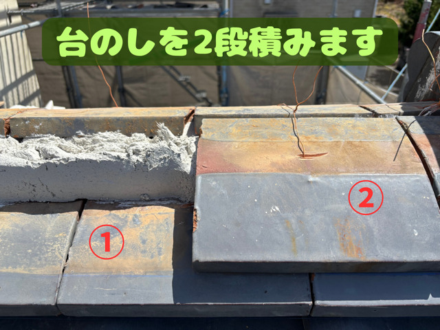 台のし積み 棟の積み直しでは、まず「台のし」と呼ばれる大のし瓦を最下段に据えます☝️陸棟は台のしを二段積んでいきます。※ 陸棟(りくむね)とは、屋根のてっぺんを水平に走る棟部分で、最も高い位置にある主要な棟のことです。 ...続きを読む2025/05/9 瀬戸市で訪問販売がきっかけに屋根点検!草が生えた隅棟にドローンで迫る現地調査