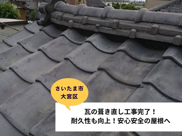 東大阪市で天井に雨音が落ちる音が気になり、調査のご相談をいただいた事例記事の続きを紹介していきます。原因は雨水の逃げ道が失われる、不適切なラバーロック工事によるものでした。前回の記事 ↓ 【東大阪市で天井に雨水が落ちてくる音が気になり調査依頼、瓦屋根には不適切なラバーロックが施されていました】今回は ...続きを読む2025/04/30 さいたま市大宮区 瓦の葺き直し工事完了!耐久性も向上!安心安全の屋根へ