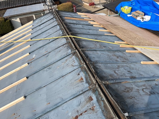 こんにちは、街の屋根やさん熊本店です。今回は、熊本市西区で発生した強風被害の現場をご紹介します。屋根の金属板が落下しそうとのご相談を受け現場に急行した所、施工不良と春の嵐により棟板金が落下寸前状態でした。被害状況の確認から応急処置の流れまで詳しくお伝えしますので、同じような被害が心配な方はぜひ参考にしてくださ ...続きを読む2025/04/17 城陽市で瓦棒屋根を立平葺きの屋根カバー工事、下地を作成している様子を紹介