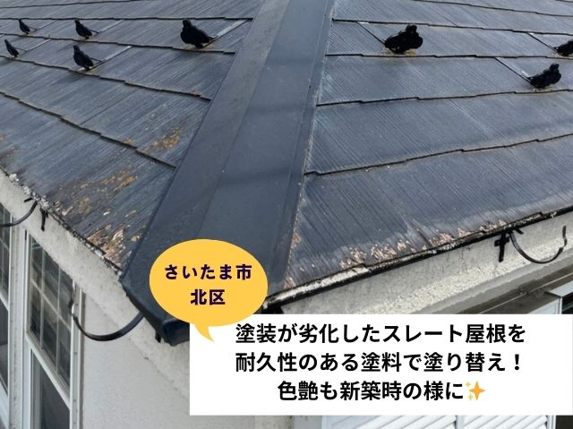 皆さんお疲れ様です。街の屋根やさんつくば稲敷店です。 前回のブログでは、つくば市の雨漏りが発生している物置建物にて、セメント瓦屋根に著しい傷みを確認した現場調査の内容をお伝えいたしました。 今回は、前回に引き続き、物置建物の外階段の波板や母家の瓦屋根などの劣化状況を確認した現場調査について、その内容をご紹介し ...続きを読む2025/04/7 さいたま市北区 塗装が劣化したスレート屋根を耐久性のある塗料で塗り替え!色艶も新築時の様に!