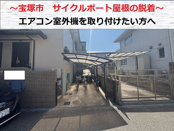 こんにちは~!街の屋根やさん高松店の三谷です(❁´◡`❁) 先日、多度津町にお住まいのお客様より、「納屋の屋根の傷みが気になる」とのご相談をいただき、現場調査を行いました。本日は、費用を抑えつつ適切に修繕を行った和瓦屋根の修理の様子をご紹介します。現地調査の様子はこちら!★雨漏り修理の費用と失敗し ...続きを読む2025/04/9 宝塚市 サイクルポートの屋根脱着相談!エアコン室外機を取り付けたい方へ