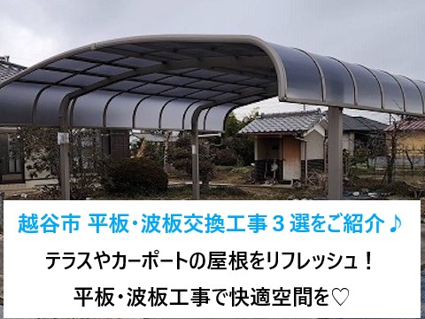 新潟市中央区にお住まいの方より、落雪によってサイクルポートの屋根が折れ曲がったので修理したいとご相談を頂きました。早速、破損したサイクルポートを確認するために現地調査を行いました。街の屋根やさん新潟店では屋根や外壁工事以外でも住まいに関するご相談を承っております。現地調査・見積は無料で行っておりますので、街の ...続きを読む2025/03/18 越谷市 平板・波板交換工事3選をご紹介♪テラス屋根・カーポート屋根のリフレッシュで快適空間を(*’ω’*)