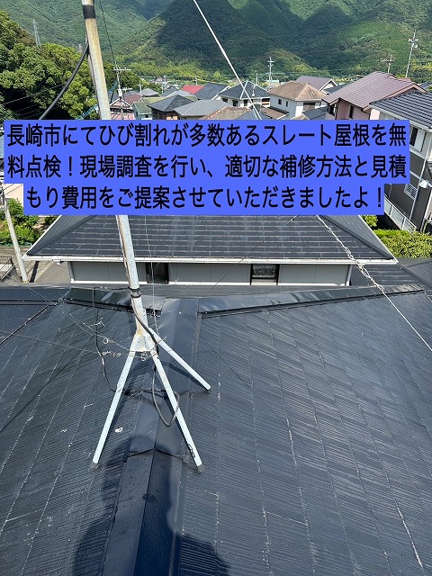 お疲れ様です!! 街の屋根やさん長崎店です♪ 本日は、長崎市にあるスレート屋根の現場のひび割れが多数ある現場での調査状態や必要な補修工事をご紹介いたします! 点検前お客様より、「近くで工事をしている業者よりスレートが割れている。棟板金がはずれかけている。」など伝えていただいていたらしく、気になり私たちにご相 ...続きを読む2025/03/8 岡崎市で栄四郎瓦の破損で点検のご相談、破損した瓦と漆喰交換・ガルバリウム鋼板で谷板金交換をご提案