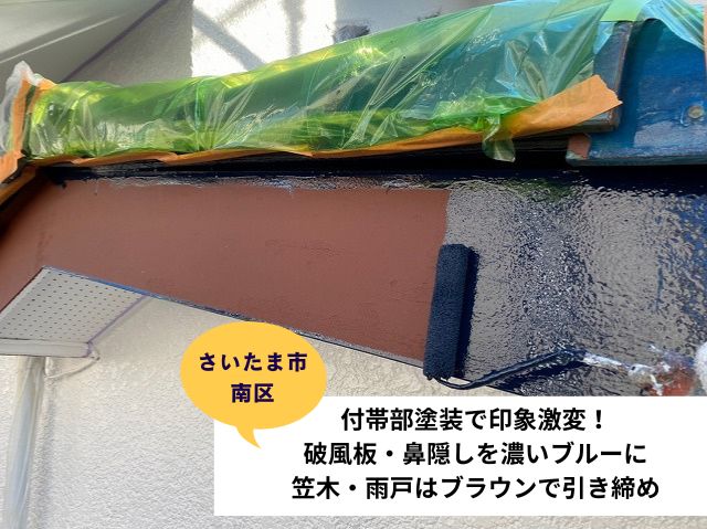 2025/03/5  さいたま市南区 付帯部塗装で印象激変!破風板・鼻隠しを濃いブルーに!笠木雨樋はブラウンで引き締め