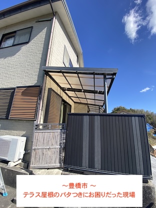 岩沼市のみなさん、おばんです!街の屋根やさん仙台太白店です!(^^)!本日は雨樋から水がポタポタと落ちてくるご自宅の雨樋工事と原因の軒継手についてご紹介していきます!雨樋には、たくさんの部位があり名称があるのはご存じでしょうか?今回はその中の軒継手が原因で水漏れが発生していました(>_<)じっくり ...続きを読む2025/03/3 豊橋市 テラスの波板屋根を無料見積り、パタパタと騒音にお困りでした。