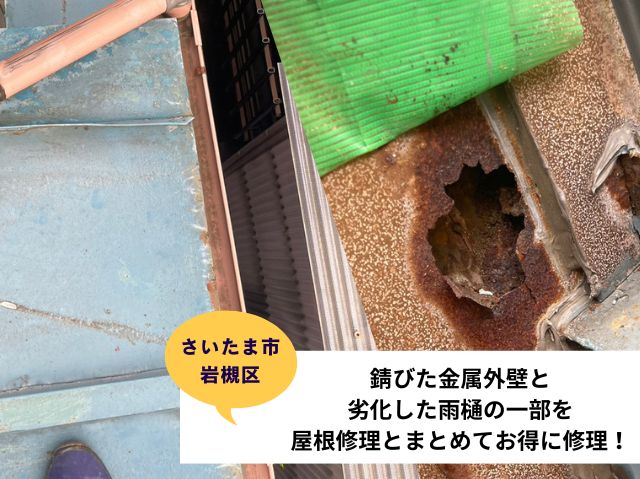 お疲れ様です!! 街の屋根やさん長崎店です♪ 本日は西彼杵郡時津町にて【棟板金】の施工の流れについてご紹介していきますね🎶 棟板金の状態は訪問業者から指摘で気付く方が多いです。 その為、状態が悪化していたり、被害が出た後に原因が分かることが多いです。 棟板金の劣化にも様々な要因がありますので ...続きを読む2025/02/28 さいたま市岩槻区 錆びた金属外壁と劣化した雨樋の一部を屋根修理とまとめてお得に修理!