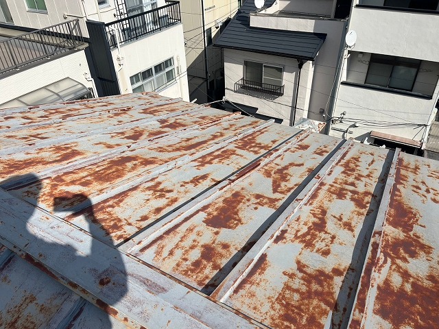 こんにちは。街の屋根やさん名古屋南店です。 前回のブログでは、名古屋市南区の施設建物の屋上で実施している通気緩衝工法によるウレタン塗膜防水工事の通気緩衝シートの敷設と脱気筒の設置の様子をお伝えいたしました。 今回は、屋上のパラペット立ち上がり部に対するウレタン防水材塗布工程について、その施工の様子をご紹介した ...続きを読む2025/02/25 大東市で瓦棒葺き屋根の空き家を購入したお客さまからご相談、経年劣化によるサビが進行していたので葺き替え工事を推奨