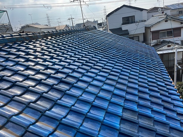 今回この車庫の屋根塗装のご依頼なんですがけっこう大きな車庫ですね、軽自動車6台は入るんじゃないかという広さです。 屋根は工場や倉庫でよくみられる「折半屋根」(金属板を折り曲げ加工した屋根材)です。折半屋根のメリットとしては、工事が短期間、部材 ...続きを読む2025/02/25 八尾市で釉薬瓦の連棟住宅で屋根点検の実施、屋根材の特徴や不具合が多い箇所の調査状況