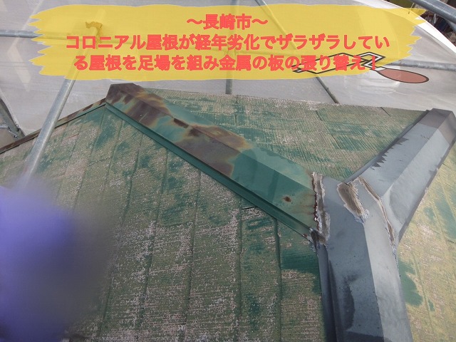 2025/02/26 長崎市 コロニアル屋根が経年劣化でザラザラしている屋根を足場を組み金属の板の張り替え!