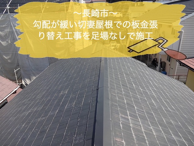 みなさまこんにちは。街の屋根やさん広島店です!いつもブログをご覧いただきありがとうございます。安佐北区のお客様より「飛び込み業者から屋根の塗装をした方がいいと言われたが、屋根の状態が分からないので調査してほしい」とのお問い合わせをいただきました。突然営業に来てお客様の不安を煽り、実際には不要であったり、高額な ...続きを読む2025/02/26 長崎市 勾配が緩い切妻屋根での板金張り替え工事を足場なしで施工