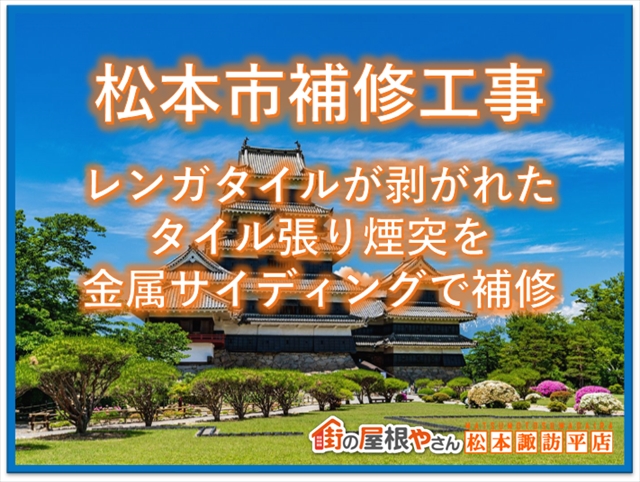 更新日 2024.6.11 本日は四日市市にてベランダ防水(ウレタン防水)を行いましたのでご紹介致します。ウレタン防水 ...続きを読む2024/06/11 松本市|レンガタイルが剥がれたタイル張り煙突を金属サイディングで補修