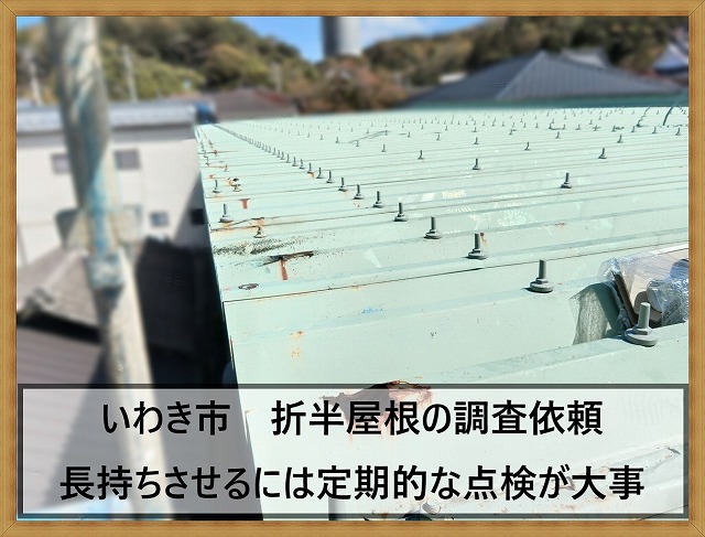 こんにちは、街の屋根やさん堺店です。本日は、羽曳野市で会社事務所棟・外壁と屋上の点検を行った様子をご紹介します。オーナー様より『そろそろ外壁塗装と屋上の防水工事を考えていて、一度見に来てほしい』とご連絡をいただきました。こちらの会社建物は、事務所棟と製造を行う作業棟に分れていました。今回点検を行うのは、事務所 ...続きを読む2024/06/6 いわき市にて屋根の調査依頼。折半屋根のボルトが錆びつき軒先には穴が開いていた
