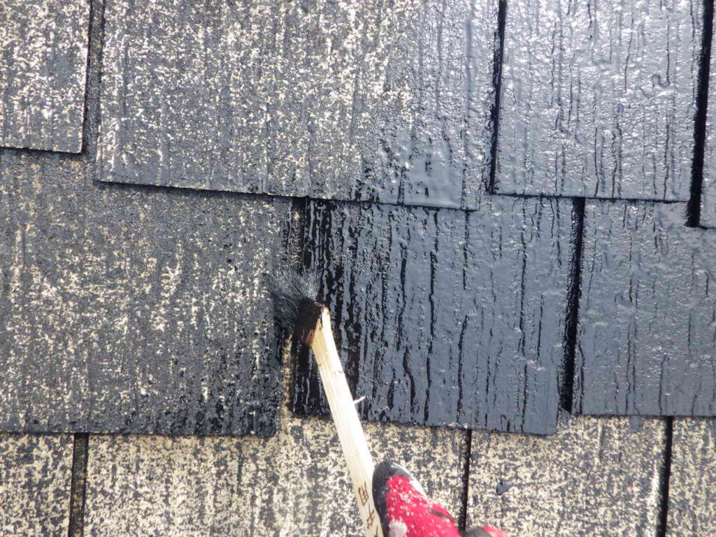 宇都宮市でスレート屋根の上塗り塗装に入りました。 昨日に引き続き、北・南・西面の中塗り塗装をしている所です。屋根材同士の間にある目地は溝が深く、ローラーだけでは塗料が奥まで入りきらないので、刷毛でしっかりと塗り込んでから全体をローラーでなじませていきます。屋根に特化した関西ペイントのスーパーシ ...続きを読む2024/06/3 吉川市で雨漏り修理!散水試験で業者の施工不良が判明…補修工事を行いました
