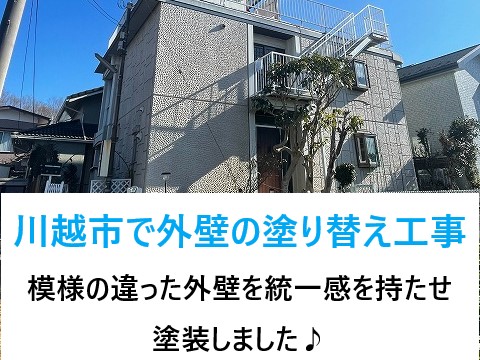 皆さんこんにちは。『街の屋根やさんいわき店』です。今回は以前に工事を行ったことがある楢葉町にお住まいのお客様からご連絡を頂きました。内容の方ですが「トイレの天井付近から雨漏りしているようなので見て頂きたい」とのことでした。雨漏りを放置してしまうと壁だけでなく中の建材も傷めてしまうので早めの対処 ...続きを読む2024/06/3 川越市で外壁の塗り替え工事を実施!耐震性に優れた軽量厚型パネル ALCの外壁塗装♪