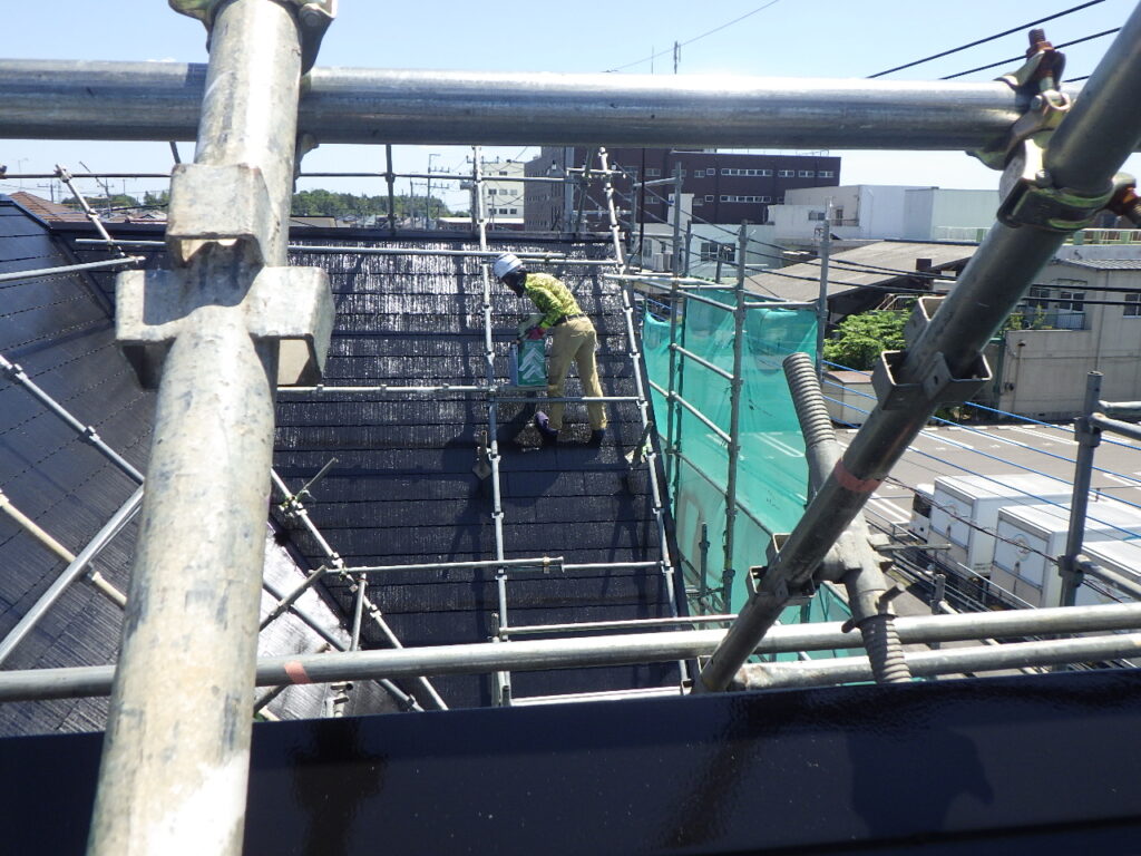 宇都宮市でスレート屋根の塗装が完了しました。 屋根の上塗り塗装中です。中塗り同様、関西ペイントのスーパーシリコンルーフペイントを使用して屋根を仕上げています。中塗りと同じ塗料を塗ることで均一な膜厚をつくり、耐久性と耐候性を向上させ長期的に保持させます。勾配のある屋根なので、足元には十 ...続きを読む2024/05/24 郡山市にて経年劣化により錆が進行したベランダ鉄骨の補修依頼