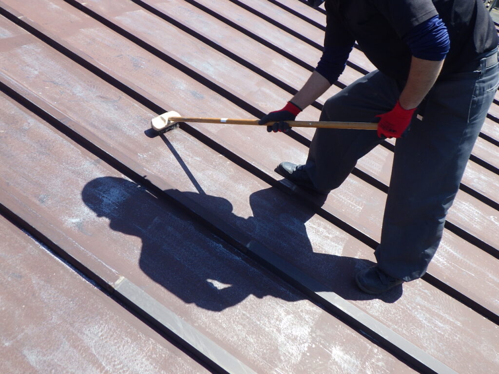 宇都宮市で錆止め塗料を使用し屋根板金の下塗り塗装をしました。 ケレン施工中です。板金部を塗装する際に、必要とする作業工程となります。板金表面をさらに削ることで、高圧洗浄で取り除ききれなかった汚れや剥がれかけている旧塗膜も綺麗に落とすことが出来ます。またケレン施工の目的として、板金表面にわざと傷 ...続きを読む