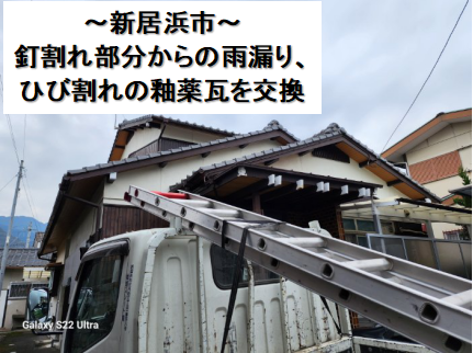 こんにちは!街の屋根やさん飯田・伊那店、遠山です。いつもご覧いただきありがとうございます!飯田市で行っている中古住宅の屋根と外壁の工事をご紹介しています。今回は2Fの外壁塗装のようすをお伝えしたいと思います。前回までの記事はこちら▼・飯田市のお客さまより、中古住宅のリフォームについてご相談いた ...続きを読む2024/05/2 新居浜市で釉薬和型のひび割れからの雨漏り。破損瓦の交換を実施しました。